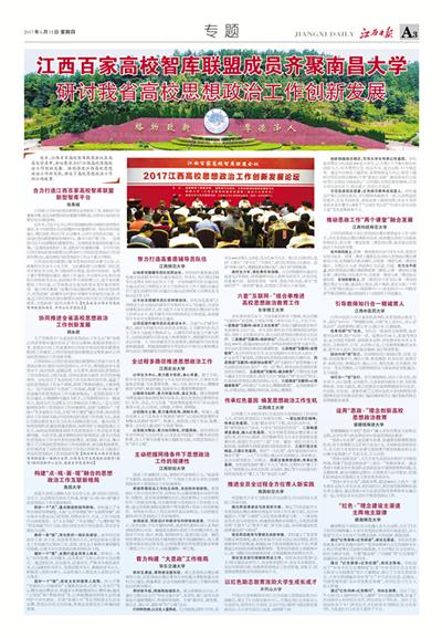 本网讯(记者许航)6月15日,江西日报在A3专题版整版刊发《江西百家高校智库联盟成员齐聚南昌大学研讨我省高校思想政治工作创新发展》文章。我校作为江西百家高校智库联盟第一届执行主席单位主办此次会议,会议聚焦2017江西高校思想政治工作创新发展,协同推进江西高校思想政治工作新实践,讲述了高校思想政治工作的江西故事。
