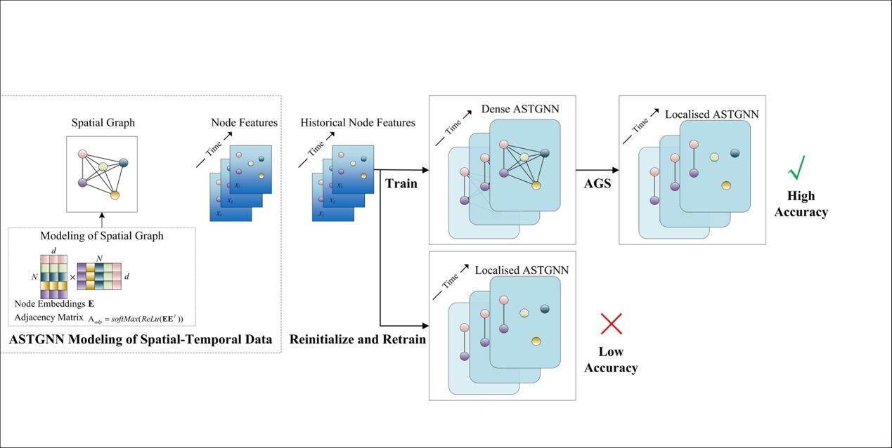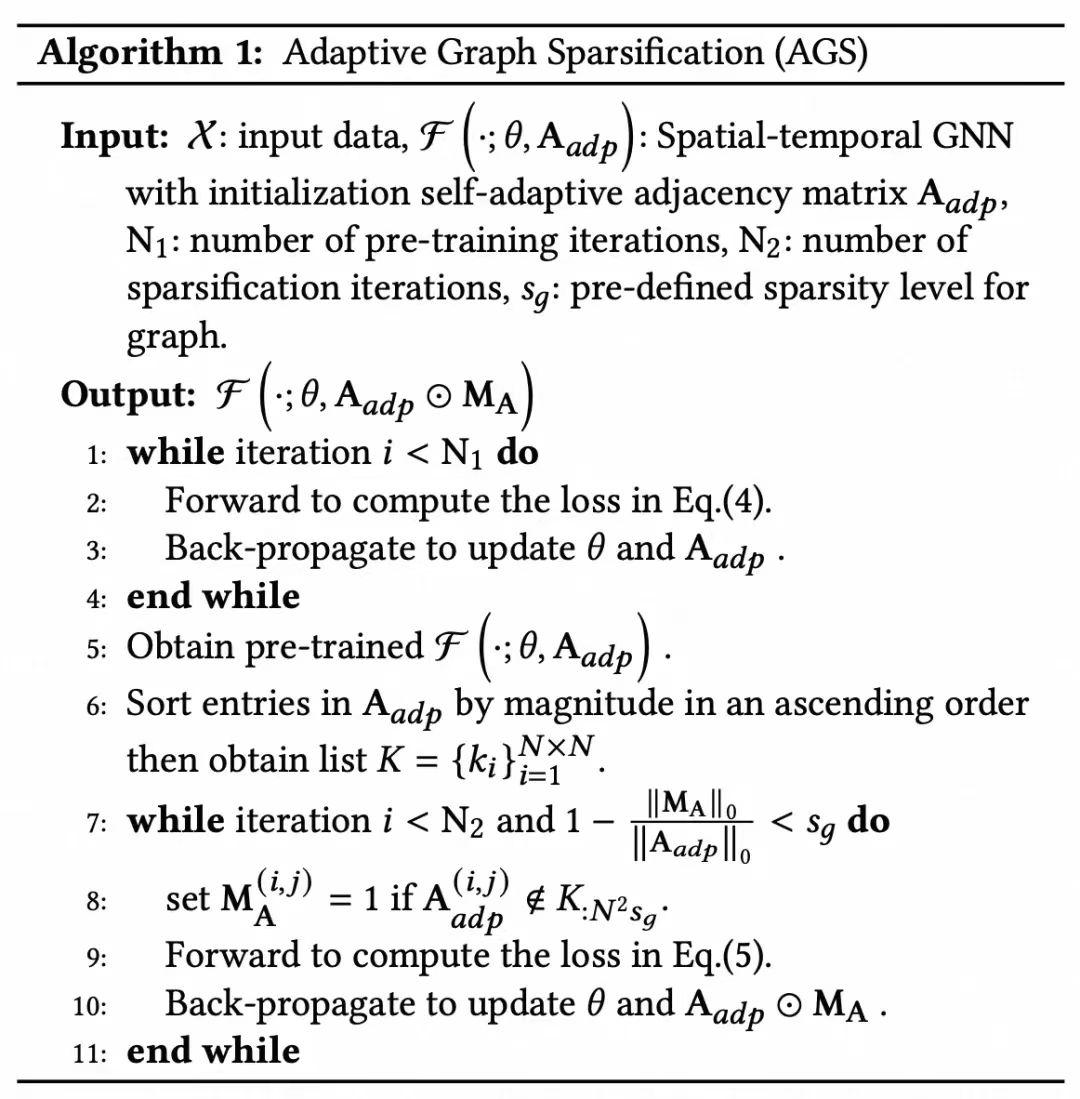 ,两者尺寸相同。整体的算法流程如下图所示,在稀疏化之前,会进行正常的时空图神经网络预训练,然后递归地对边进行剪枝。