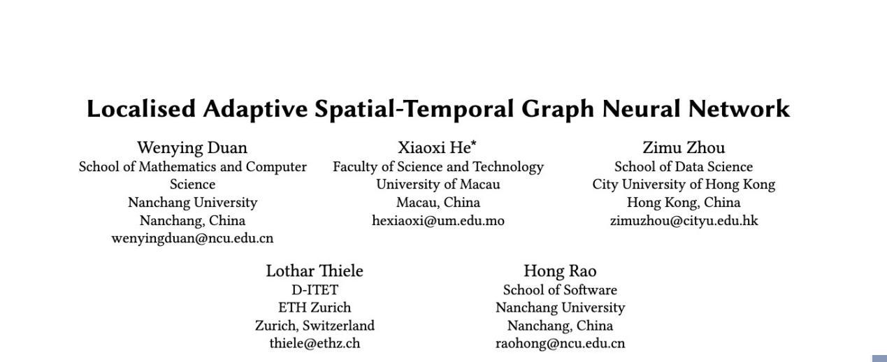本网讯(数学与计算机学院)近日,我校数学与计算机学院段文影博士的论文“Localised Adaptive Spatial-Temporal Graph Neural Network”被第29届国际知识发现与数据挖掘大会(ACM SIGKDD Conference on Knowledge Discovery and Data Mining,以下简称KDD 23)接收并正式出版。该论文由南昌大学、澳门大学、香港城市大学与苏黎世联邦理工大学共同完成,论文由南昌大学段文影博士担任第一作者,澳门大学何晓溪助理教授担任通讯作者,香港城市大学周子慕助理教授,欧洲科学院院士、苏黎世联邦理工大学前副校长Lothar Thiele教授和南昌大学软件学院饶泓教授为共同作者、南昌大学为第一署名单位,这也是南昌大学首次在该会议上发表论文。