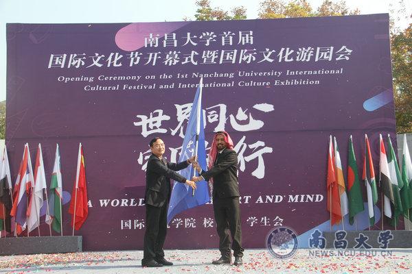 本网讯(记者涂金凤,学生记者房安琪、李蕙、戴琳等)11月27日上午,我校首届国际文化节在休闲广场举行。党委书记喻晓社宣布开幕并授旗,校长周创兵、省外办国际处处长李智勇、省教育厅国际处副处长刘艳红出席开幕式并致辞。