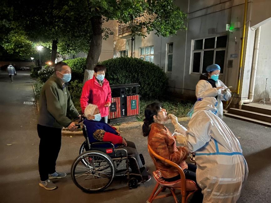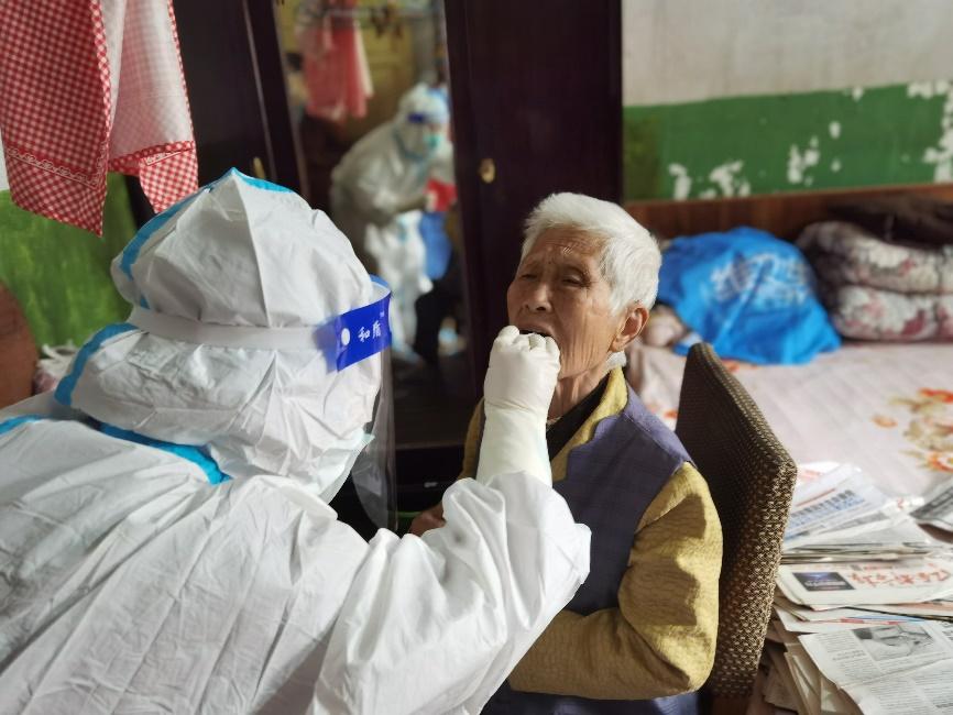 除了与社区工作人员、志愿者密切配合驻守采样点,队员们根据社区安排化身采样“机动部队”。19日晚护士付紫薇在中山路街头与社区工作人员逢人便问“今天的核酸做了吗?”,为无法赶上小区采样的群众提供便利。护士熊娟、陶婷所在的采样点皆是无电梯老式住宅,有许多行动不便、高龄老人等需要上门核酸。每天完成采样点任务后,队员们顾不上休息就开始投入上门采样工作,半天下来爬楼入户多则数十趟。每次开门都是一份温暖的交互,老人们费力地辨认着队员防护服上的名字,像自己的儿孙辈一样称呼她们;或者热情地想留队员歇脚喝茶,家属们的道谢也是一声接着一声。