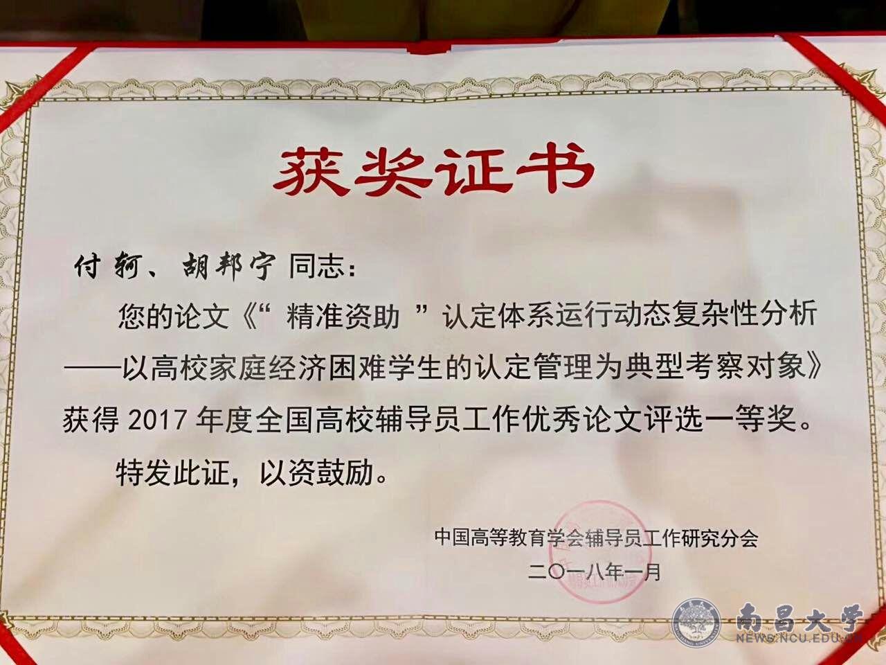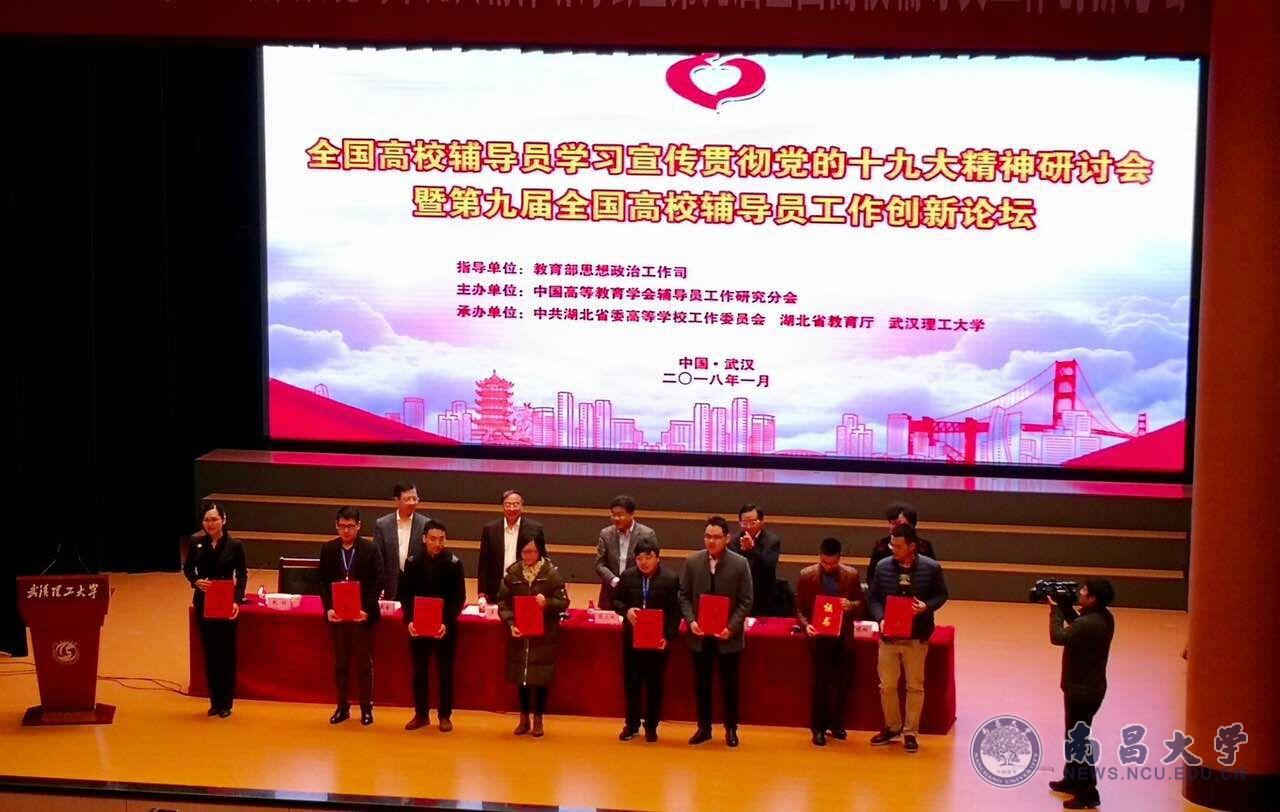 本网讯(学工委办)1月21日上午,由教育部思政司主办的全国高校辅导员学习宣传贯彻党的十九大精神研讨会暨第九届全国高校辅导员工作创新论坛在武汉理工大学举行,会议宣读了2017年全国高校辅导员工作优秀论文获奖名单并为获奖辅导员颁奖。由我校理学院辅导员付轲和人文学院辅导员胡邦宁撰写的《“精准资助”认定体系运行动态复杂性分析——以高校家庭经济困难学生的认定管理为典型考察对象》荣获一等奖。