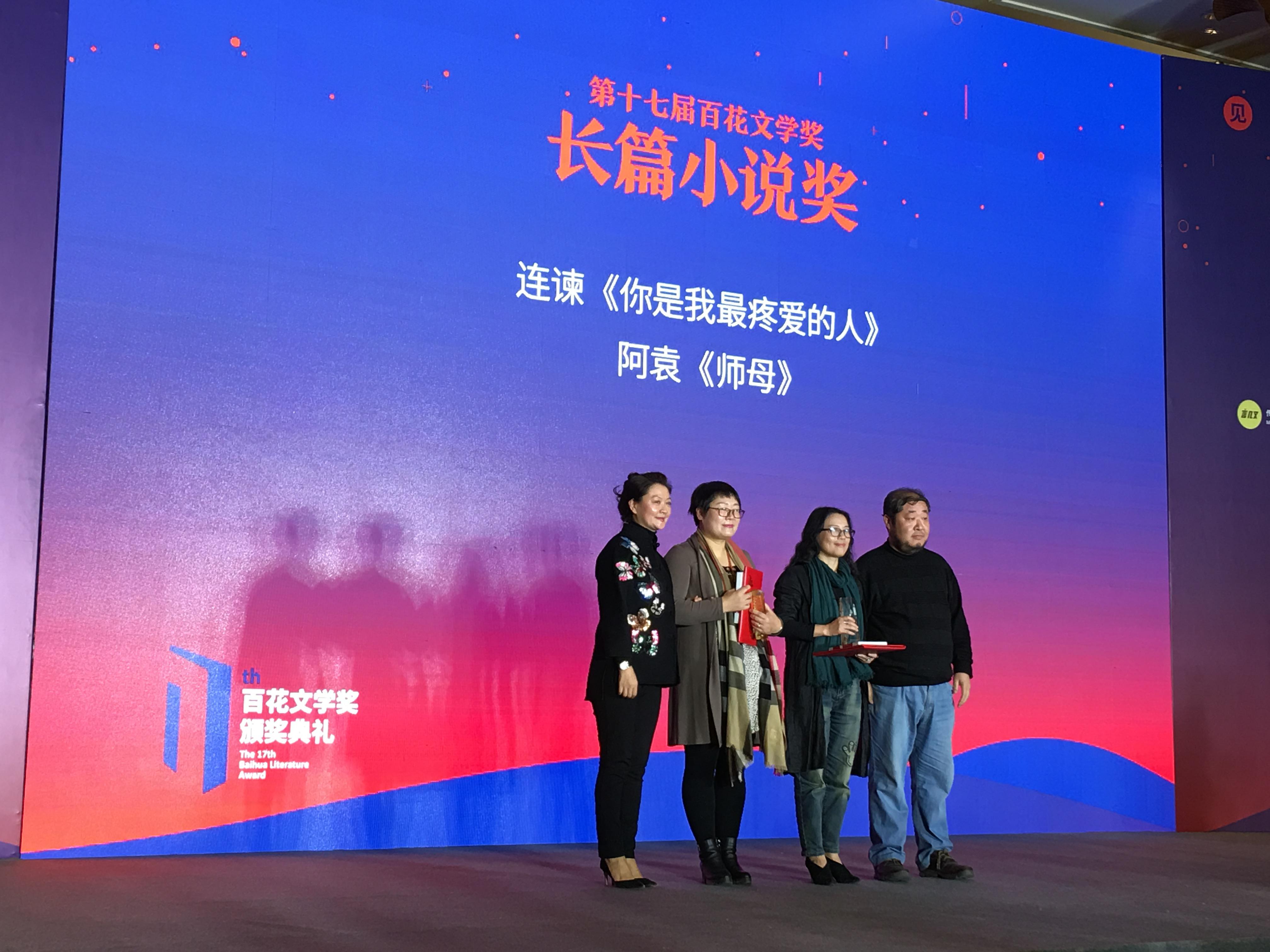 本网讯(学生记者段连青)12月9日,在第十七届百花文学奖颁奖典礼上,我校人文学院教授袁萍(笔名阿袁)创作的作品《师母》获得十七届百花文学奖长篇小说奖。