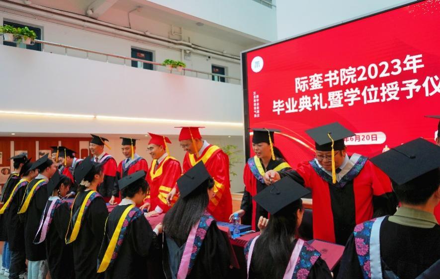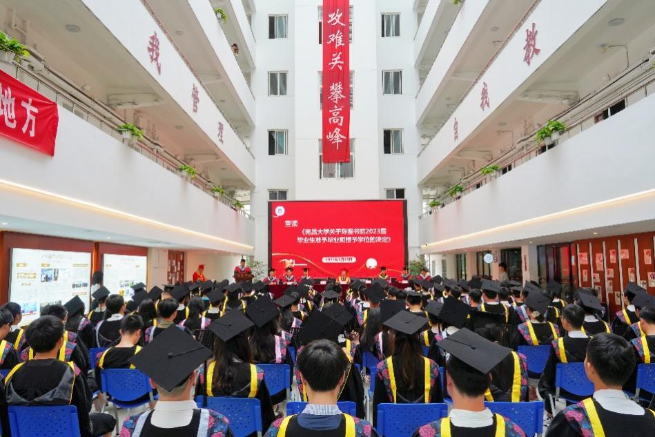 与会领导嘉宾为毕业生颁发毕业证书、学位证书,并拨正流苏。现场,还宣读了《南昌大学关于际銮书院2023届毕业生准予毕业和授予学位的决定》《南昌大学关于表彰际銮书院优秀毕业生的决定》。
