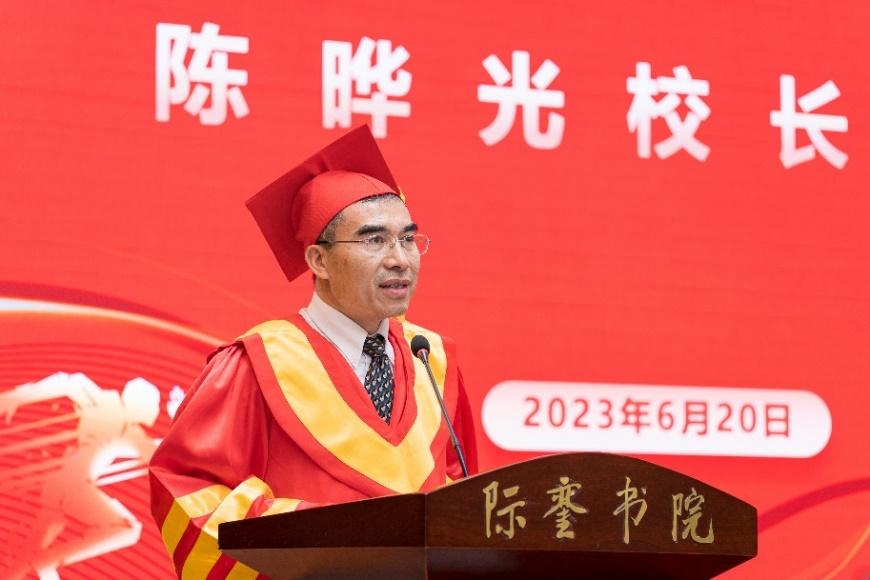 本网讯(际銮书院 胡敏杰)路向长江上,扬帆细雨时。6月20日,际銮书院2023年毕业典礼暨学位授予仪式举行。校长、中国科学院院士陈晔光出席仪式。副校长刘耀彬主持仪式。