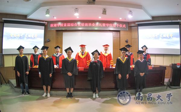 会议宣读《南昌大学关于首届综合实验班准予毕业和授予学位决定》。学位授予仪式上,学校领导与前湖学院、教务处、学生工作处相关负责人为91位毕业生颁发毕业证书、学位证书并拨正流苏。