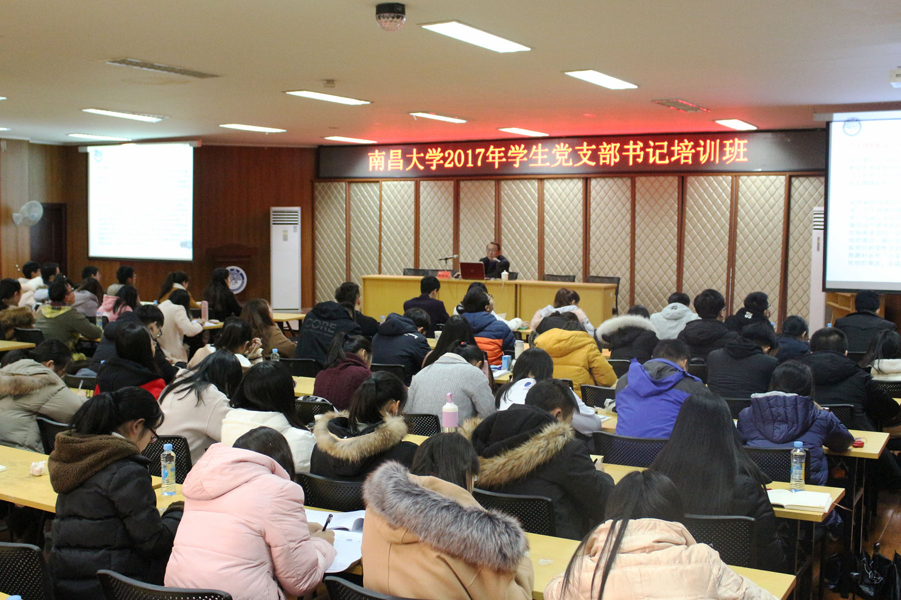 本网讯(学工委办)12月15日上午,由学工委办、学工处、党委组织部、党校、党委宣传部主办的2017年南昌大学学生党支部书记培训班在昌海楼A313报告厅举行。全校各学院学生党支部书记、大学生学习习近平新时代中国特色社会主义思想研究会党员骨干、学生中国特色社会主义理论学习研究会及各学院分会党员骨干等300余名学院参加培训。