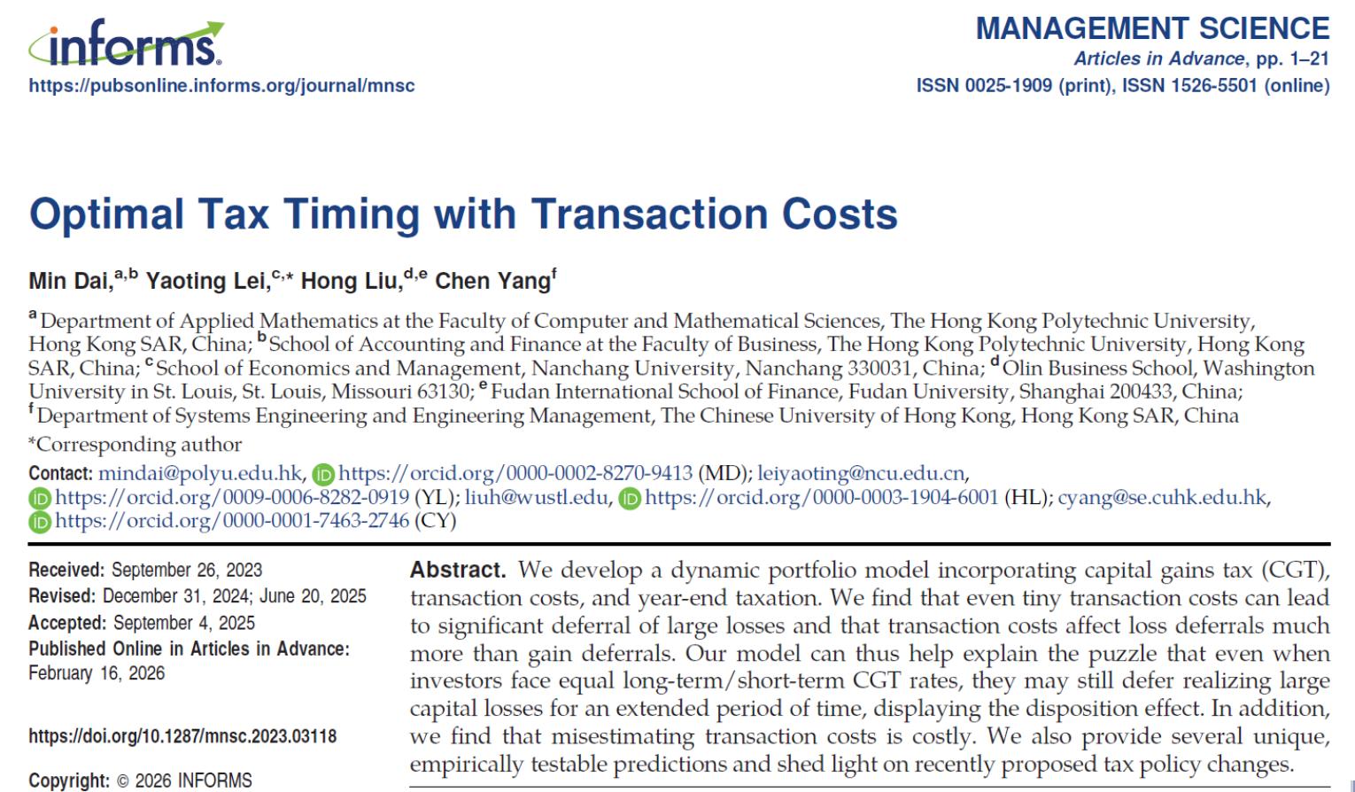 本网讯(经济管理学院)近日,经济管理学院雷瑶婷副教授作为通讯作者,与香港理工大学Min Dai教授、圣路易斯华盛顿大学Hong Liu教授、香港中文大学Chen Yang教授合作的学术论文“Optimal Tax Timing with Transaction Costs”,在管理学国际顶级期刊Management Science在线发表,这是雷瑶婷副教授第二次在该顶刊发表成果。