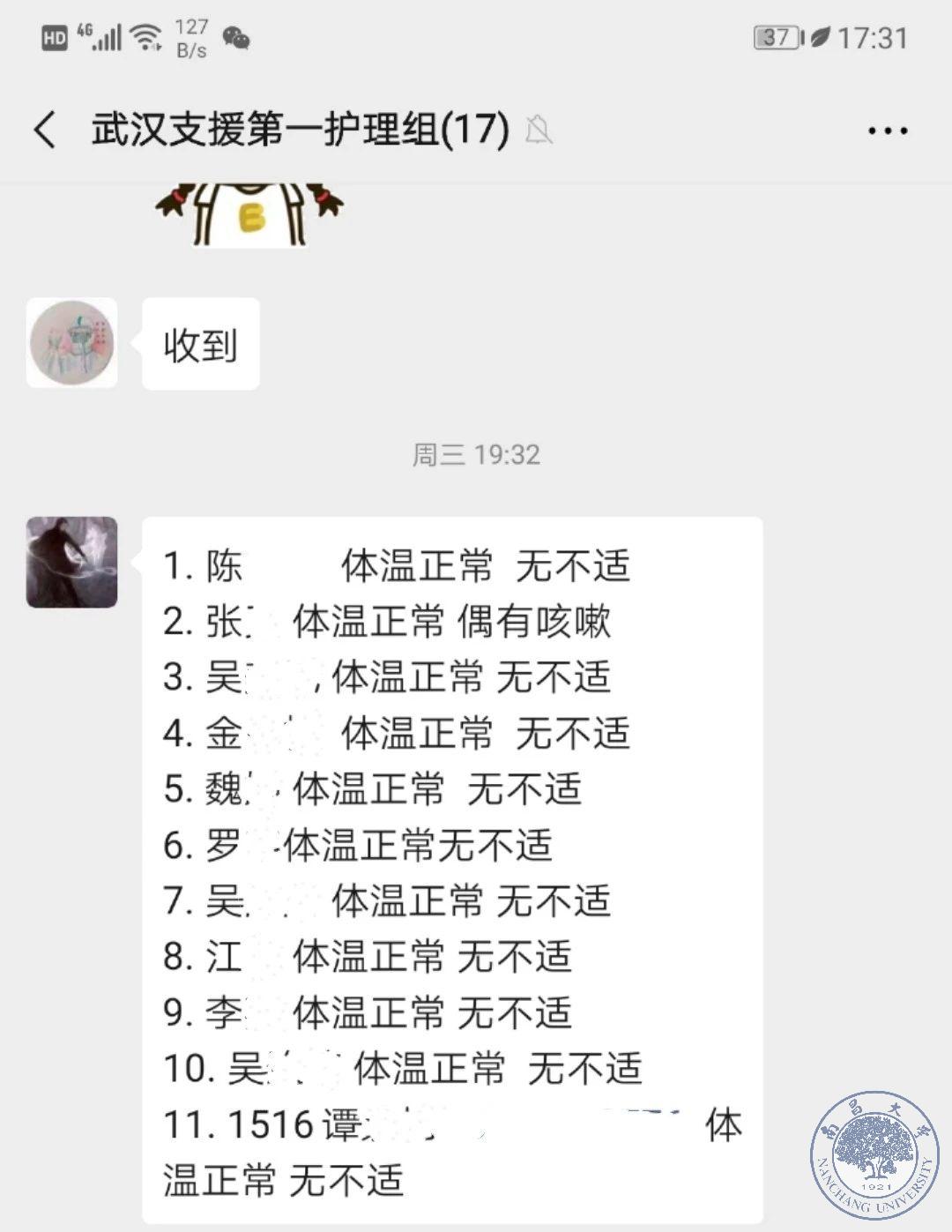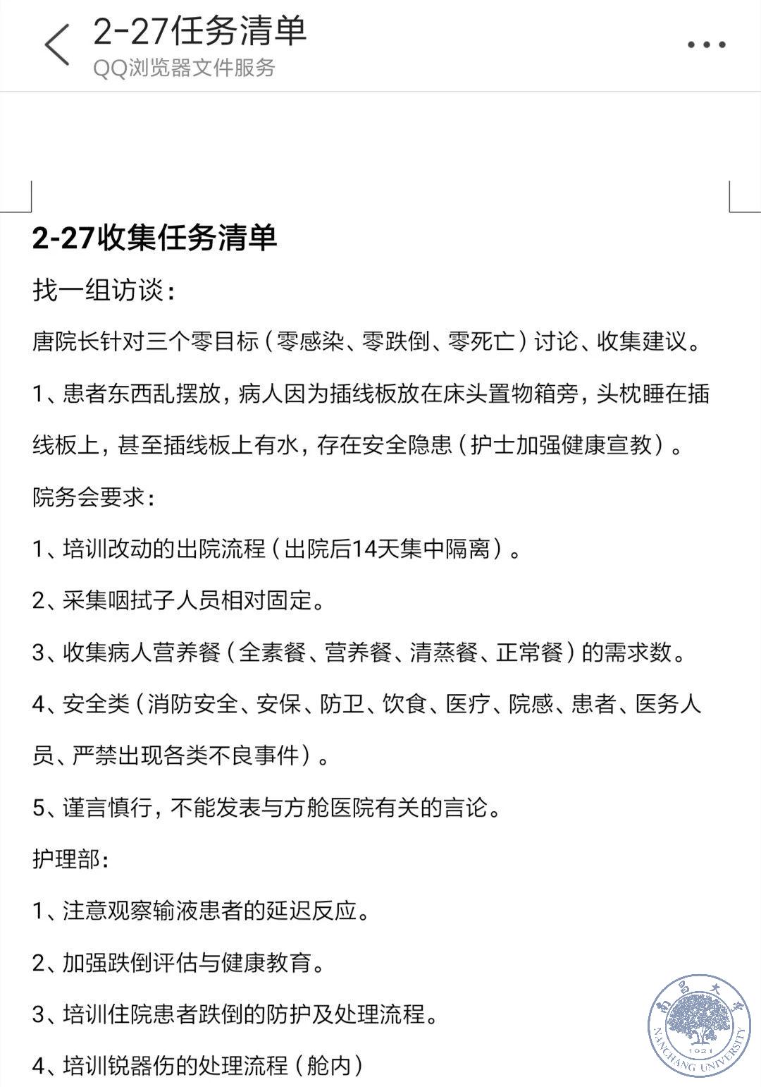 “自下而上”查找问题,是从主题教育中提炼出的检视排查问题的工作方法。江西队实行护士健康情况日报告和组长工作日报告制度,每天收集每个护士身体情况、精神状态以及生活中遇到的困难等信息,组长每天要汇报本组工作中遇到的问题、需要交接的特殊情况。“我们对每天收集的信息进行汇总和梳理,如果护士身体出现了状况,我们马上按照江西队《方舱工作护理人员健康管理》流程进行上报及治疗,对生活中遇到的困难,我们也会想尽办法去解决。对于每组反映的工作问题,我们会进行调研,提出解决方案。”唐浪娟介绍。
