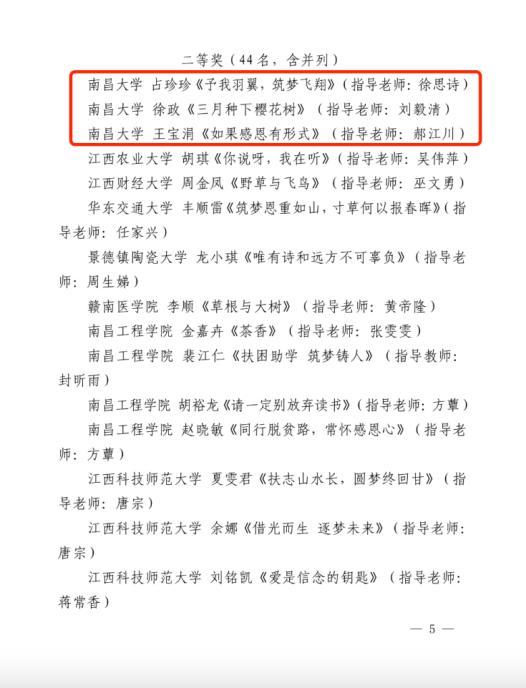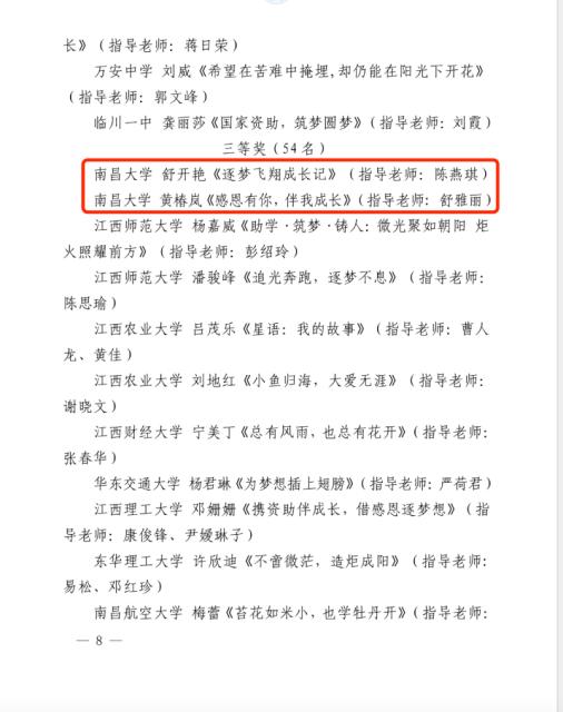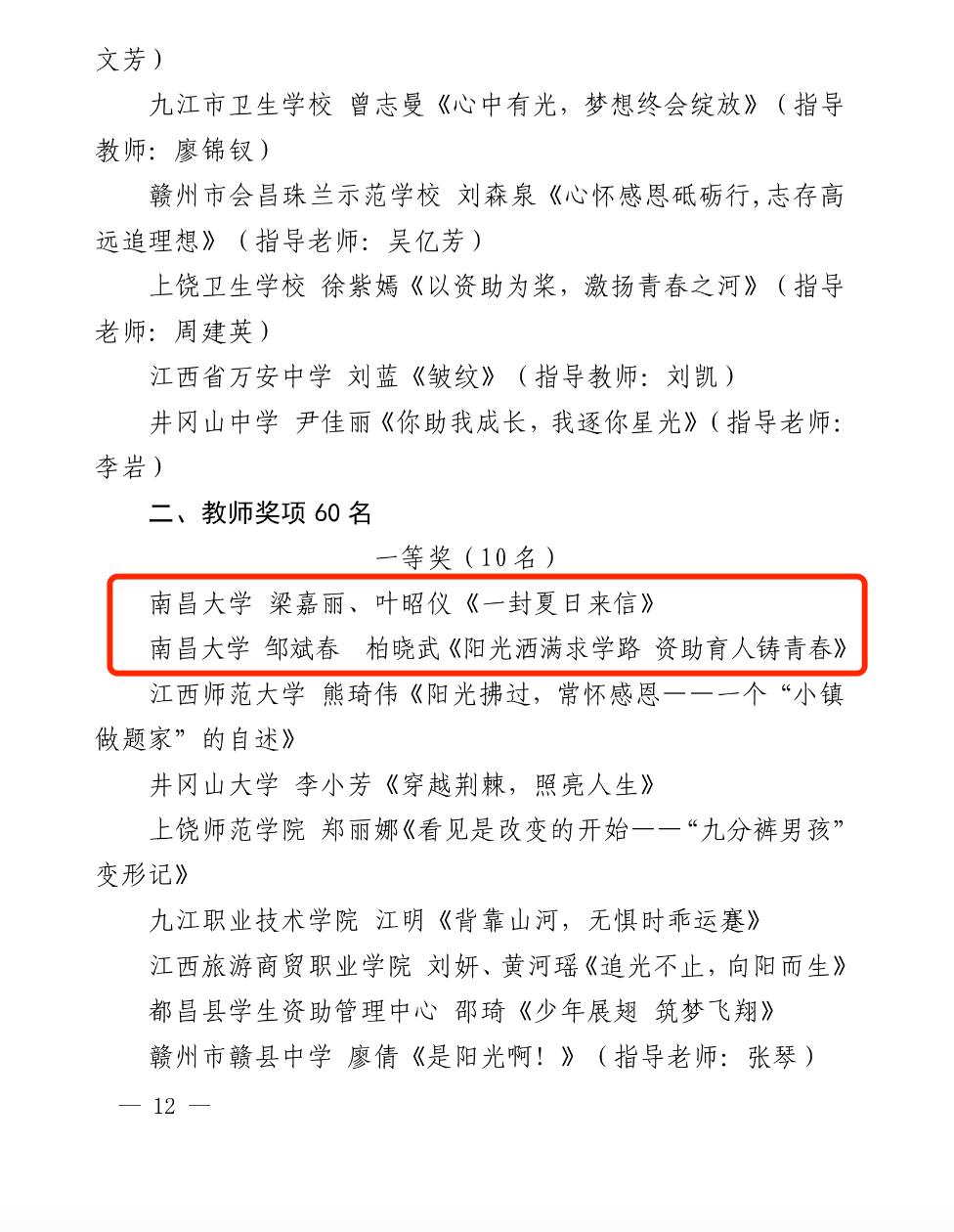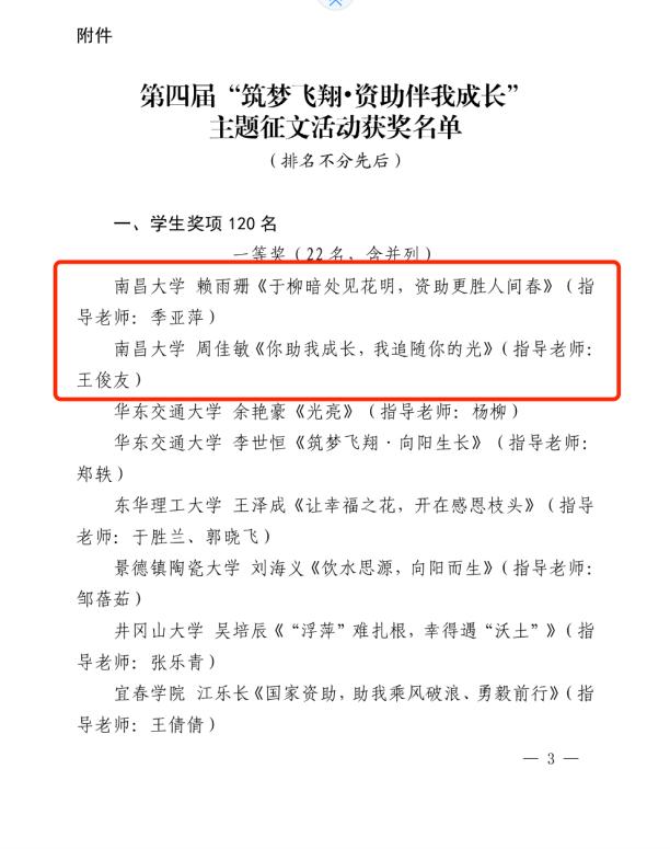 据悉,此次征文活动从2023年4月开始启动,南昌大学学生资助中心精心组织,广大师生积极参与、踊跃投稿,共征集到征文706份。经过学校推荐、专家综合评审等环节,最终人文学院梁嘉丽等获教师组一等奖;公共政策与管理学院赖雨珊等获学生组一等奖,第一临床医学院占珍珍等获学生组二等奖,食品学院舒开艳等获学生组三等奖。详情见附件。