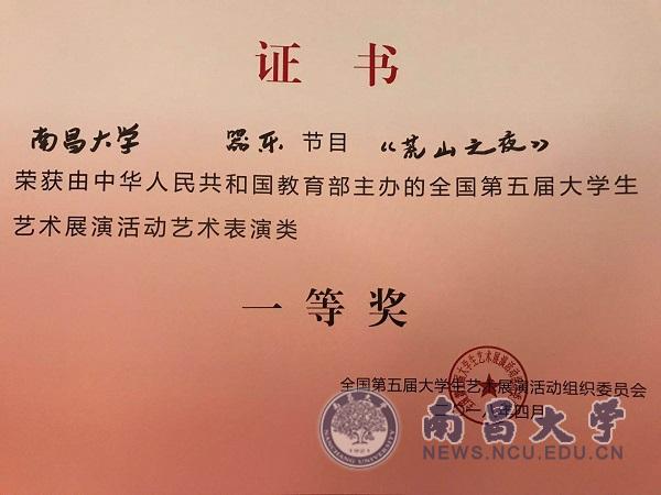 本网讯(艺术与设计学院)第五届大学生艺术展演全国总决赛4月16日—21日在上海举行。南昌大学交响乐团合奏《荒山之夜》参加了器乐专场的比赛,并获器乐组全国总决赛一等奖,大赛评委给予“不鸣则已,一鸣惊人”的高度评价。