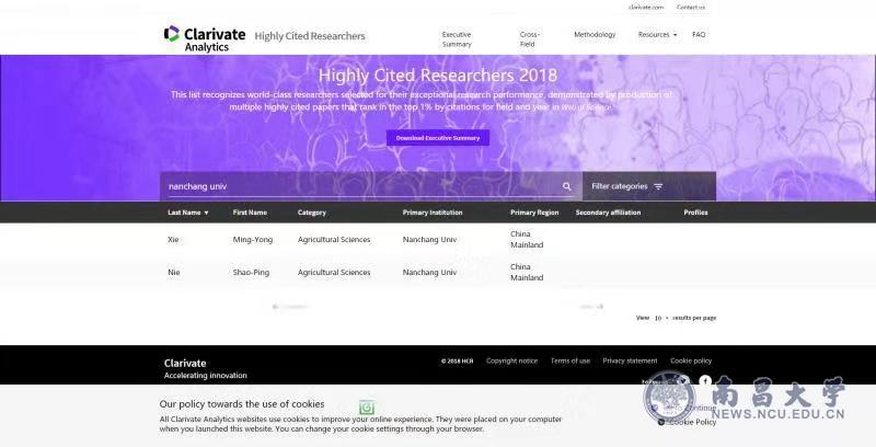 本网讯(发规处)11月27日,科睿唯安发布了2018年“高被引科学家”榜单,我校谢明勇教授、聂少平教授入选农业科学领域高被引科学家,这是我校首次有科学家入选此榜单,也是我省首次入榜。