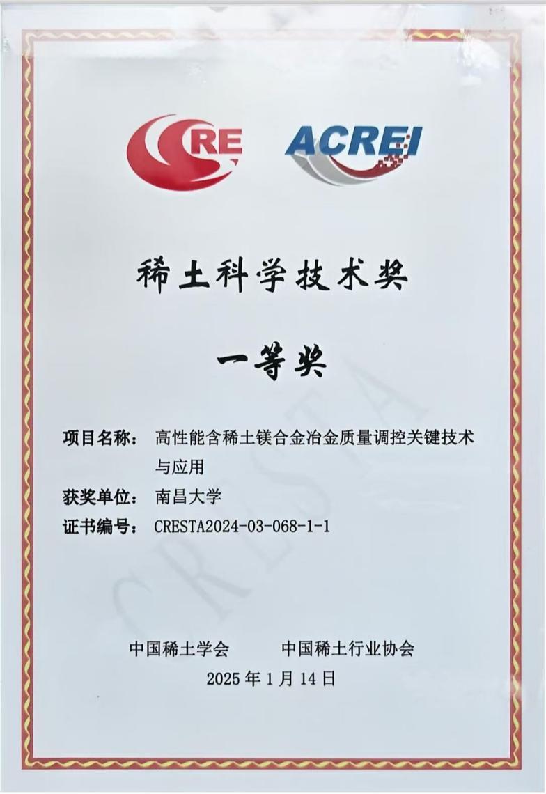 会议颁发了“2024年度稀土科学技术奖”,南昌大学刘勇教授牵头负责项目《高性能含稀土镁合金冶金质量调控关键技术与应用》荣获一等奖。该成果历经十余年产学研协同攻关,联合东北大学、山西银光镁业、包头稀土研究院、龙南龙钇等公司,开展了含稀土变形镁合金成分设计,建立了基于关键特征结构的高性能含稀土变形镁合金设计准则;开发了液态成形和组合变形加工技术,完成了全链条组织结构调控,实现了产业化制备和应用。该成果授权专利 17 项、参与制定国家标准 5 项、发表学术论文 26 篇,实现了稀土在镁合金的高效、平衡、高值利用。成果在相关企业的军机构件、导弹壳体、高铁型材、锻造轮毂、3C产品壳体等系列产品中规模化应用,近三年新增产值达 10.03 亿元、利润超1.72 亿元,经济与社会效益显著。