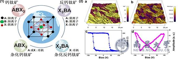 图一. (1) 钙钛矿结构与分类。(2) 反钙钛矿铁电体[(CH3)3NH]3(MnBr3)(MnBr4)的电畴结构及PFM(压电力显微镜)滞后回线。
