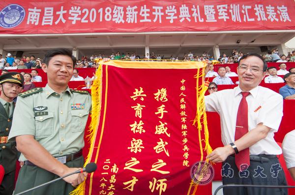 喻晓社代表学校向陆军步兵学院赠送锦旗,对陆军步兵学院关心支持南昌大学建设发展表示感谢。我校江西发展研究院院长黄细嘉宣读《南昌大学关于表彰2018年优秀“学长小教员”、学生军事训练优秀学员的决定》。