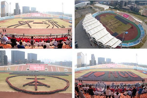 场地上不断变幻着“1921江西医专”“1940的大门”“1958”“1993南昌大学”“211”“山水”“双一流”“本”“I love NCU”等图案,每一个图案都代表着南昌大学的重要历史时期,新生们用这种方式展示了南昌大学的历史沿革与时代画卷。