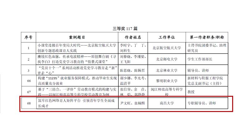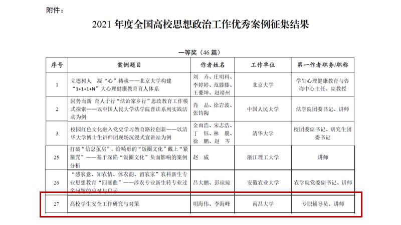 本网讯(学生工作处 张楠熙)近日,2021年度全国高校思想政治工作优秀案例征集活动结果公布,我校辅导员明海伟、李海峰的案例《高校学生安全工作研究与对策》获全国一等奖,尹文旺、张楠熙的案例《筑牢红色网络育人矩阵平台 引领青年学生全面成长成才》获全国三等奖。
