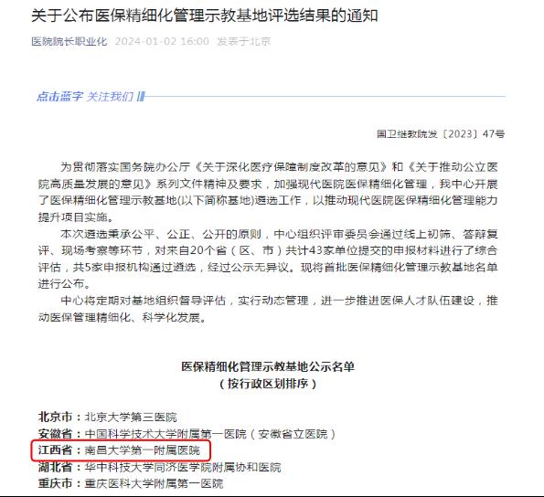 本网讯(第一附属医院)近日,国家卫生健康委能力建设和继续教育中心公布了“医保精细化管理示教基地”遴选名单,我校一附院成功入选,为江西省唯一入选医疗机构。