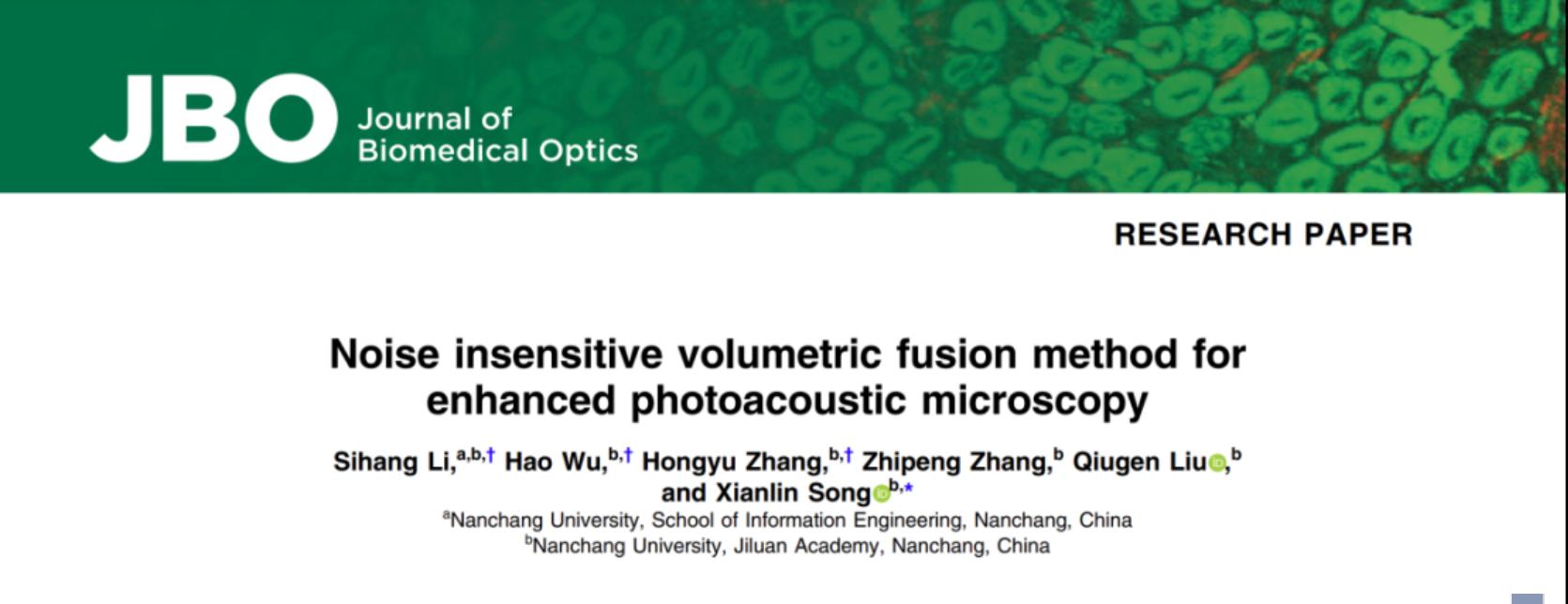 10月4日,生物医学光子学领域顶级国际期刊Journal of Biomedical Optics刊登宋贤林团队的论文Noise insensitive volumetric fusion method for enhanced photoacoustic microscopy(用于增强型光声显微成像的抗噪体积融合方法)。宋贤林为文章通讯作者,课题组成员本科生李思行、本科生吴浩和本科生张宏宇为文章的共同第一作者,本科生章志鹏参与了相关工作。