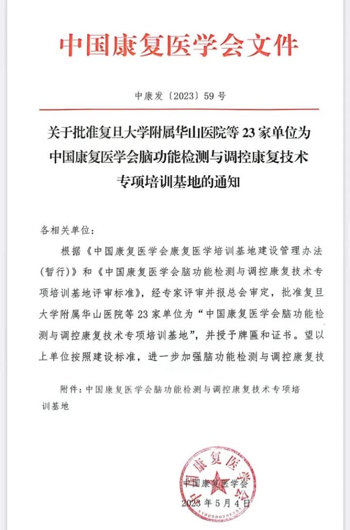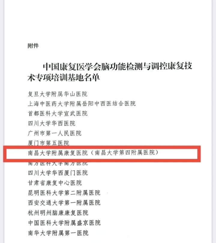 本网讯(附属康复医院)5月4日,中国康复医学会公布了一批中国康复医学会脑功能检测与调控康复技术专项培训基地建设单位名单,南昌大学附属康复医院成功获批。