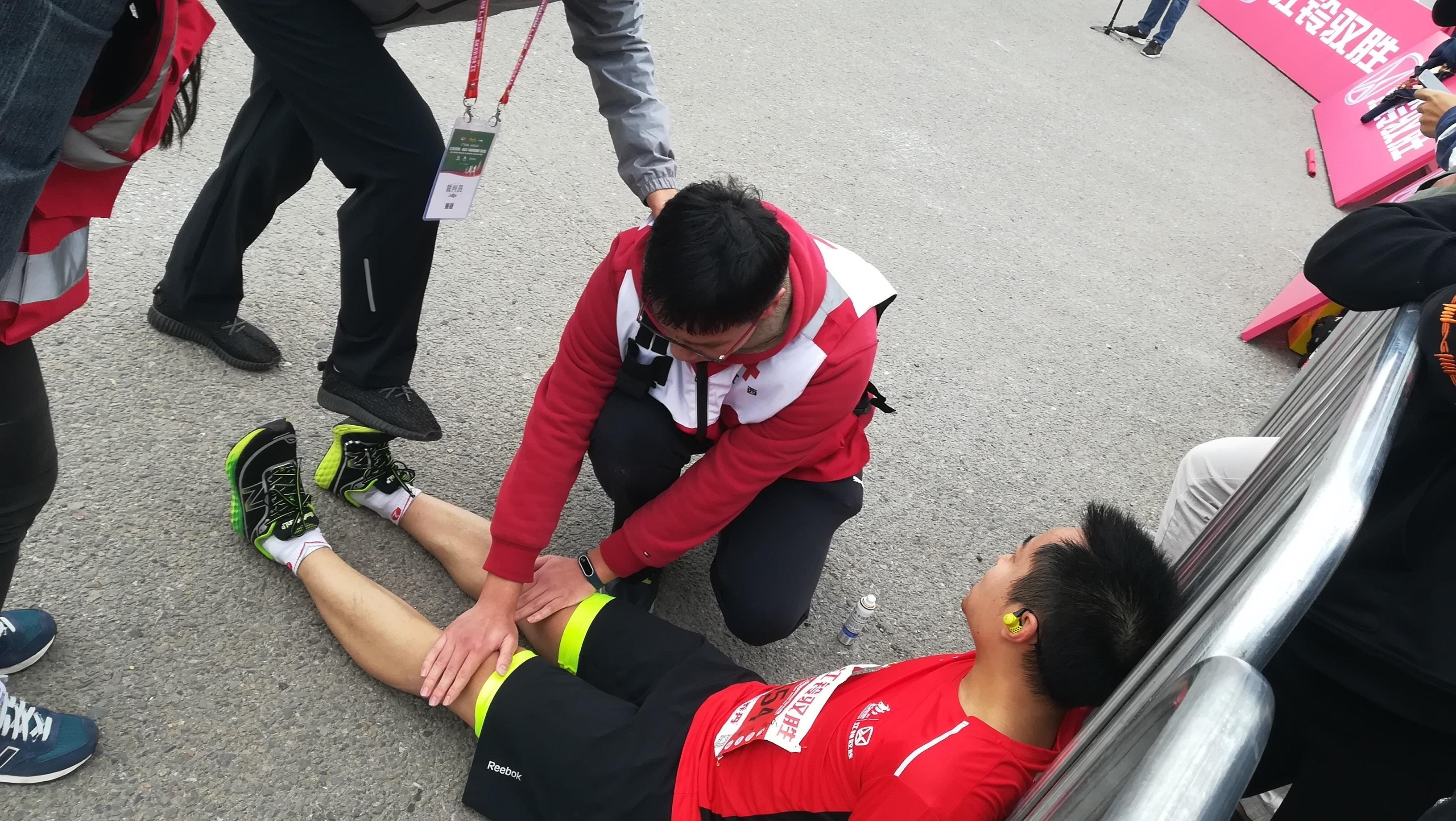 比赛当天,一名运动员在折返点处抽筋,由胡辰睿带领的医疗小组发现情况后,迅速将运动员带离赛道,并对运动员进行拉伤恢复处理。医疗救护志愿者一直等到最后一名运动员跑离赛段,看着他们缓缓离去的身影,满足而又快乐。