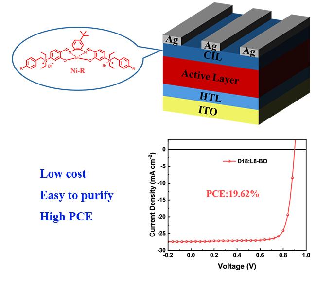 该材料通过两步化学反应高效合成,只需通过重结晶提纯,总收率高达73%,成本低至6元/g,远低于当前优秀阴极界面材料的成本。将其引入到PM6:L8-BO太阳能电池体系中,光电转换效率达到了19.11%,优于当前优秀阴极界面材料PDINN的18.52%和PNDIT-F3N的18.5%,这类材料具有良好的通用性能,在PM6:BTP-eC9和D18:L8-BO体系分别实现了19.06%和19.62%的光电转换效率。该工作首次将席夫碱金属配合物用作有机太阳能电池的阴极界面材料。相关研究成果以Cost-Effective Schiff-Base Nickel Complexes as Cathode Interlayers for High-Efficiency Organic Solar Cells为题发表在Angew. Chem. Int. Ed.(DOI:10.1002/anie.202523765),论文第一作者是南昌大学博士生李文亮。
