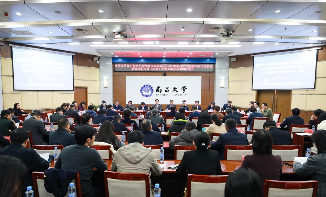 中国教育国际交流协会对南昌大学开展来华留学生高等教育质量再认证现场审查专家组、教育部教育质量评估中心对南昌大学开展口腔医学本科专业认证现场考察专家组成员,中国教育国际交流协会相关负责人,江西省教育厅相关负责人,我校各相关职能部门主要负责人、各学院院长、相关工作人员参加会议。