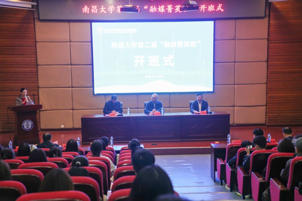 刘耀彬在开班仪式上讲话,他充分肯定了学校党委宣传部融媒体中心和新闻与传播学院创新开展产教融合实践育人这一新模式,以及一年以来“融媒菁英班”发展成效。希望融媒菁英班学子勇担时代使命,培养独立思考、文本构建、人际交往能力,涵养记录历史、服务社会、爱校荣校情怀,珍惜学校提供的创新学习平台,夯实融媒素养,努力成长为创新型新闻人才,服务学校“双一流”大学建设大局。