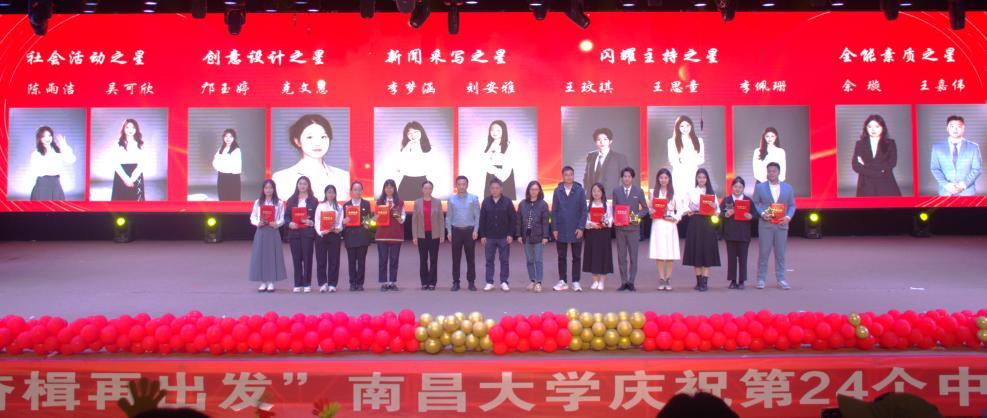 8日晚,南昌大学庆祝第24个中国记者节文艺晚会“启航新征程、奋楫再出发”开幕。晚会前举行了“蒋宪彬励志奖学金”“肖继忠创意奖学金”颁奖仪式,晚会中穿插了“新火之星”学生先进典型颁奖仪式,以勉励广大新传学子向先进模范学习,争做新时代优秀青年。