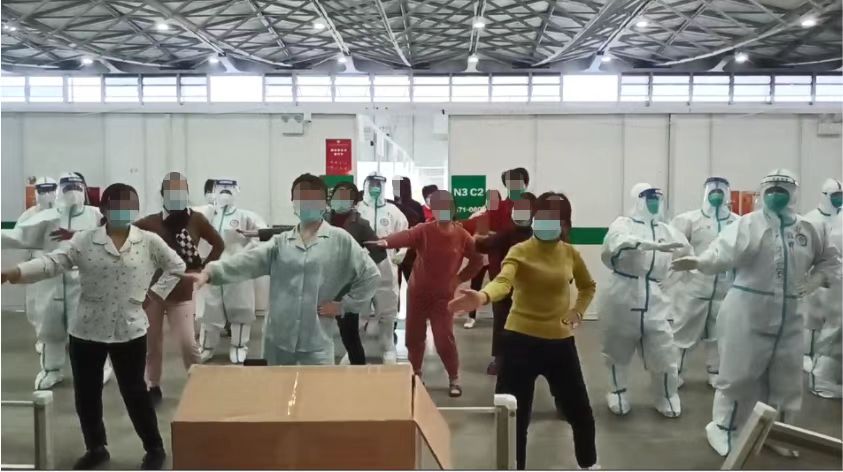 上海新国博中心方舱医院,江西援沪医疗队和患者一起跳广场舞。(受访者供图)