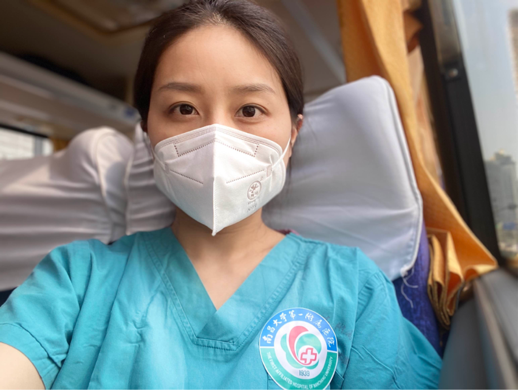 付文甜在前往上海新国博中心方舱医院大巴车上。(受访者供图)