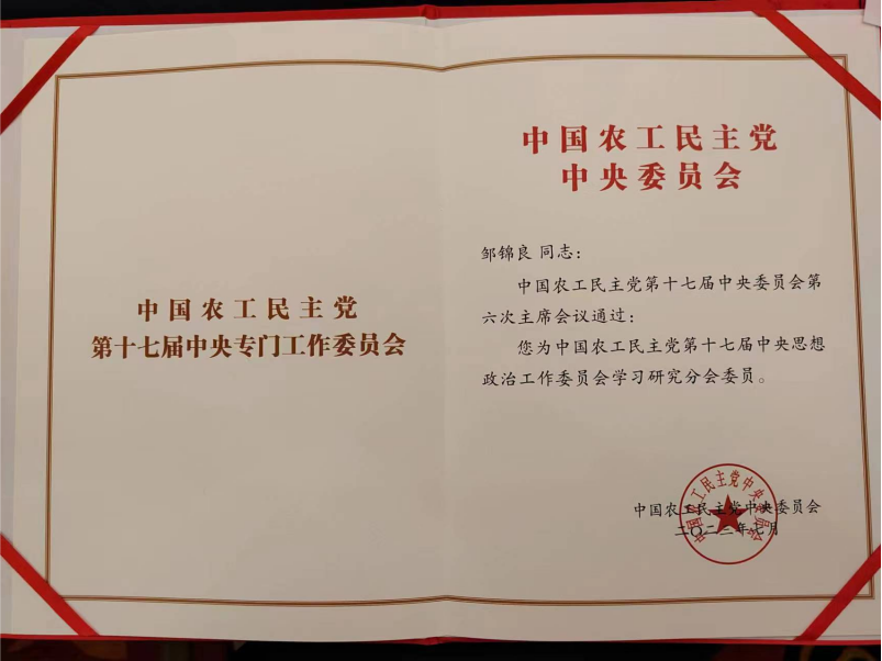 农工党第十七届中央专委会由思想政治、健康中国建设、美丽中国建设、人口均衡发展、绿色发展、区域协同发展、经济、社会法治与联络、教育科技、乡村振兴发展、文化体育艺术等11个专门工作委员会,共543名成员组成。其中,农工党南昌大学委员会副主委兼一总支主委邹锦良获聘农工党第十七届中央思想政治工作委员会委员,农工党南昌大学委员会委员兼一附院支部主委吕金雷获聘农工党第十七届中央教育科技工作委员会委员。