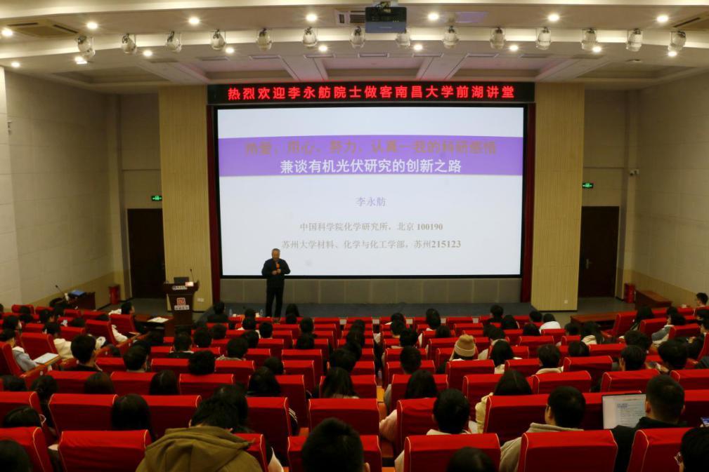 本网讯(际銮书院、学生记者 张悦)12月14日,中国科学院院士李永舫应邀做客南昌大学“前湖讲堂”第三十九期,以《热爱、用心、努力、认真——我的人生和科研感悟兼谈有机光伏研究的创新之路》为题作学术报告。