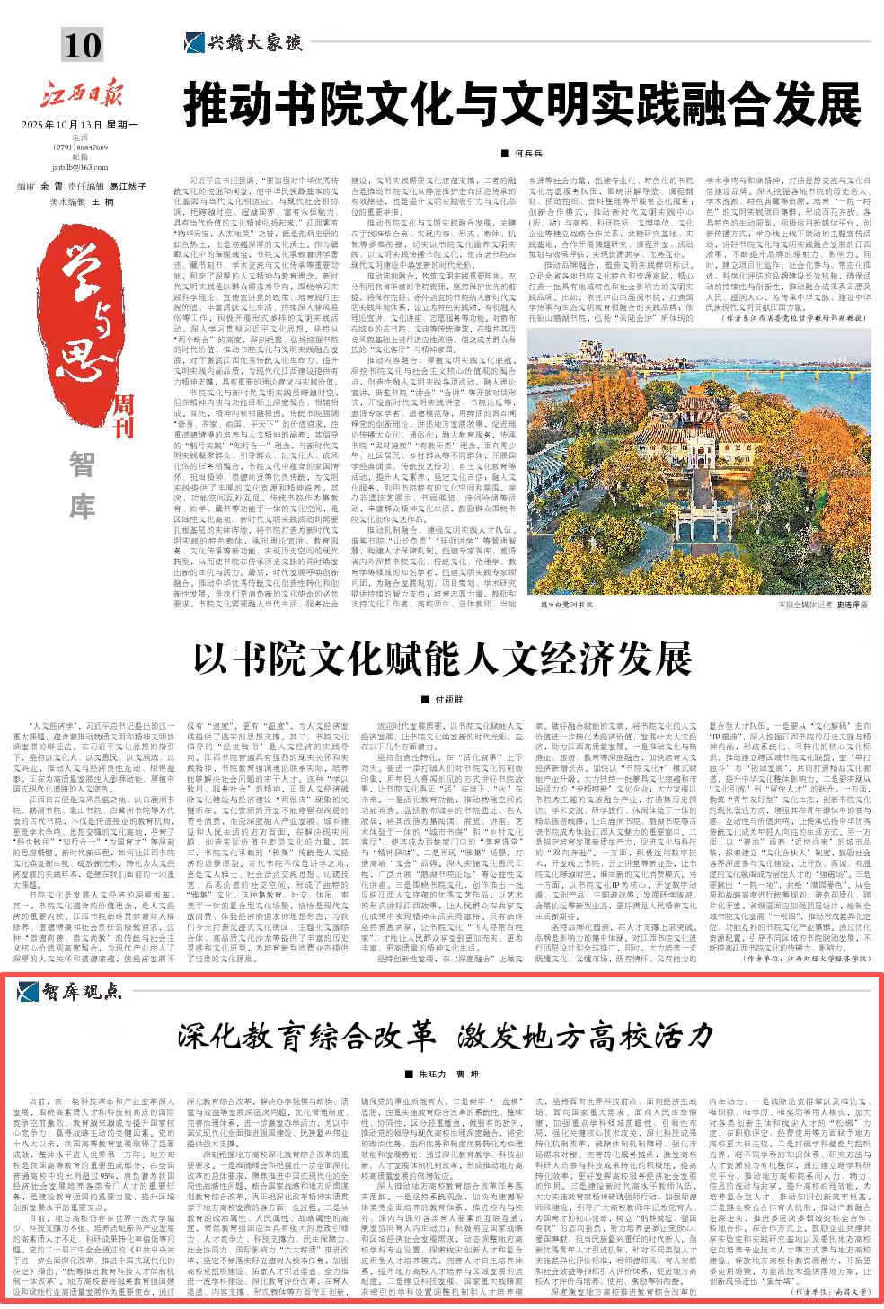 编者按:10月13日,《江西日报》“学与思”周刊以《深化教育综合改革 激发地方高校活力》为题刊登我校政策研究与综合改革办公室朱旺力、曹坤撰写的理论文章,详情如下: