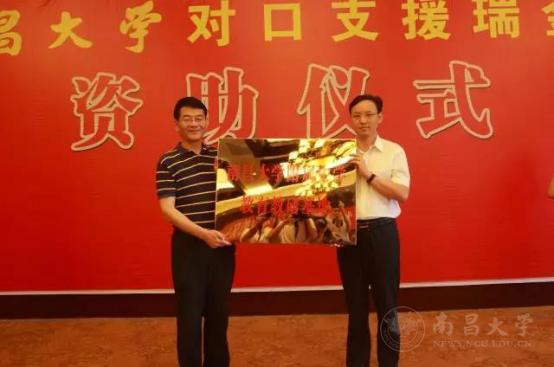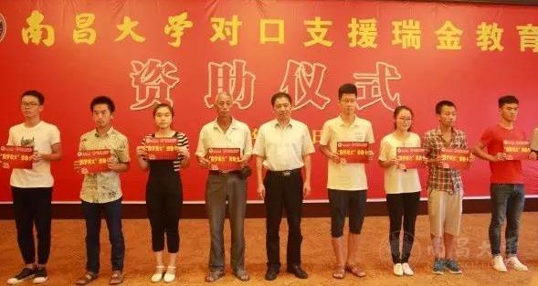 本网讯(记者宋志豪)8月15日上午,南昌大学对口帮扶瑞金教育资助仪式在瑞金举行,南昌大学与瑞金市人民政府签订“圆梦南大”项目合作协议,从今年至2020年,每年资助10名考取南昌大学瑞金籍家庭经济困难学子,免除其就读期间全部学费。