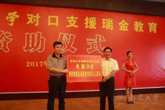 舒明为首批10名2017级瑞金籍家庭经济困难新生发放资助卡,学校相关单位负责人向瑞金市井冈山小学捐赠30台电脑及10万元塑胶跑道启动资金,南昌大学附中和瑞金四中校长为“南昌大学附属中学教育教研基地”揭牌。