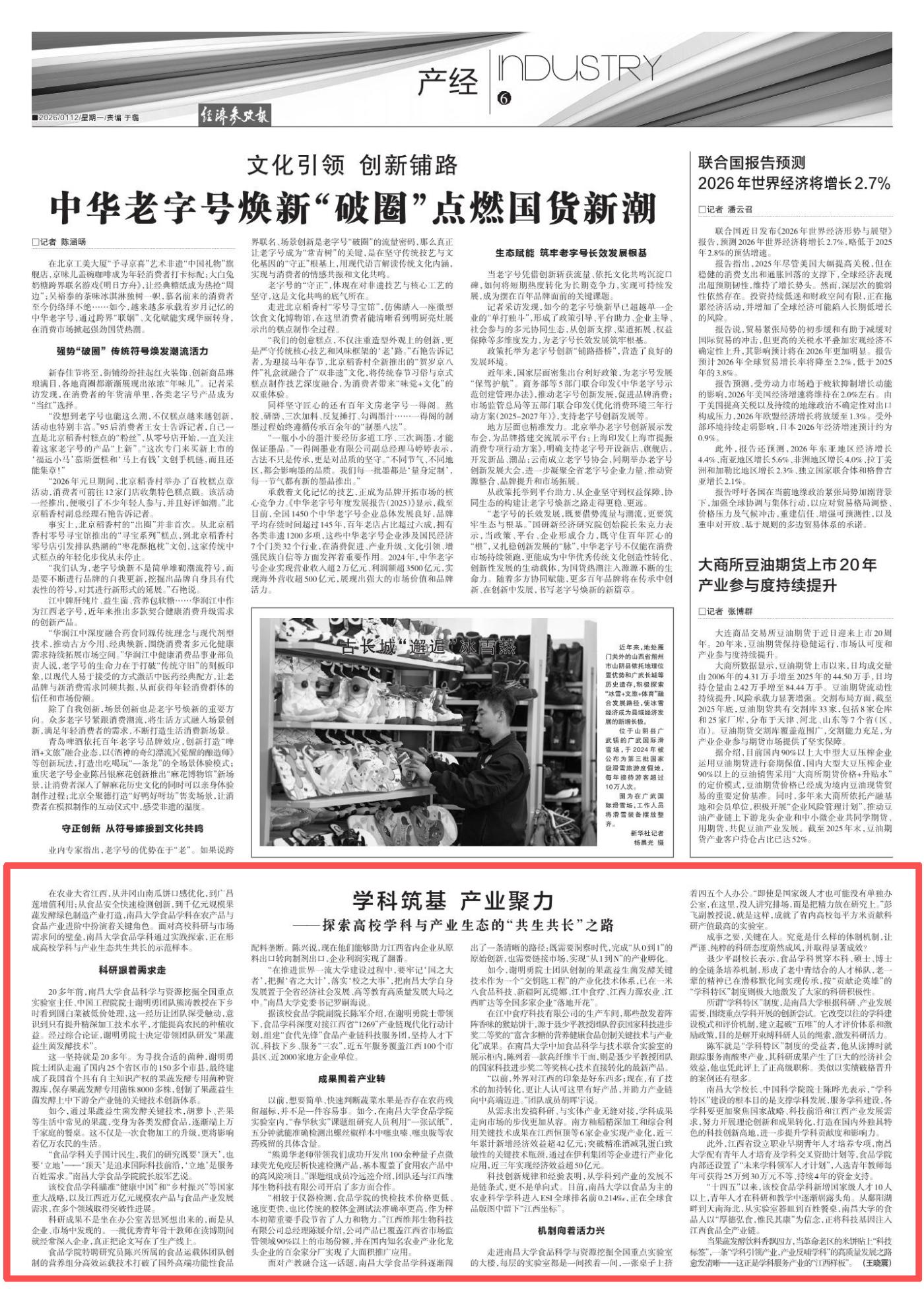 编者按:为深入学习贯彻党的二十届四中全会精神,全面落实习近平总书记关于教育的重要论述以及考察江西、视察南昌大学的重要讲话精神,回顾总结南昌大学“十四五”期间发展成就,科学谋划“十五五”时期发展蓝图,特开设【一路耕耘一路歌】专栏。专栏聚焦学校强化党的建设、深耕思政教育、夯实学科建设、建强人才队伍、推动文化传承、守护医疗健康、服务国家战略、助推地方发展、建设一流大学等方面推出系列报道,展现学校扎根红土地、奋进新时代的生动实践。本期刊发新华社《经济参考报》发布的题为《学科筑基 产业聚力——探索高校学科与产业生态的“共生共长”之路》的文章,报道我校食品学科通过实践探索,正在形成高校学科与产业生态共生共长的示范样本。内容如下: