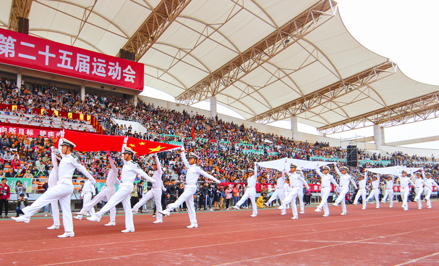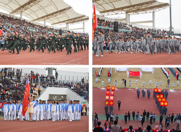 伴随着激扬的《运动员进行曲》,十八名身着雪白戎装的国防生仪仗队庄重地托举着国旗、校旗、运动会会旗步入运动场;鲜花方阵、彩旗方阵和36个学院学生方阵,迈着整齐的步伐紧随其后,展示了学子们青春飞扬的风采。