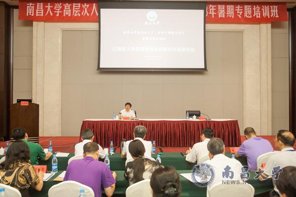 本网讯(记者许航)8月29日,副省长孙菊生应邀为南昌大学高层次人才、处级干部能力提升暑期专题培训班学员作专题辅导。校党委书记喻晓社主持报告会。