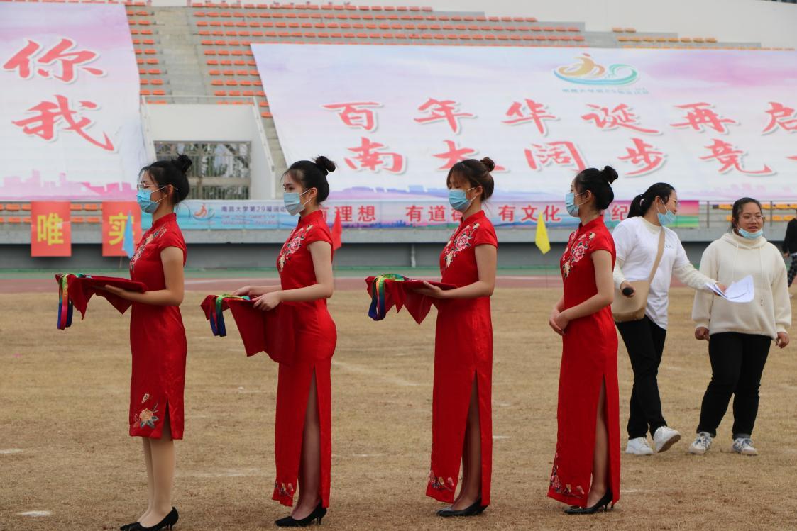 颁奖礼仪人员着一袭旗袍,袅袅婷婷,步履款款,成为运动会上一道道靓丽的风景线。“很荣幸能够见证运动健儿的荣誉,将体育精神届届传递,我将努力做好服务工作。” 艺术与设计学院表演201班的李欣怡告诉记者。