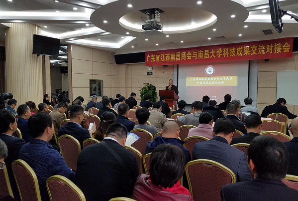 本网讯(科技处)1月6日,由广东省江西南昌商会和南昌大学共同举办的科技成果交流对接会在广州召开。广东省江西南昌商会会长付松山和62家广州公司负责人参加会议。校长周创兵致辞并介绍了学校发展情况。副校长邓晓华回答了企业提出的相关问题。