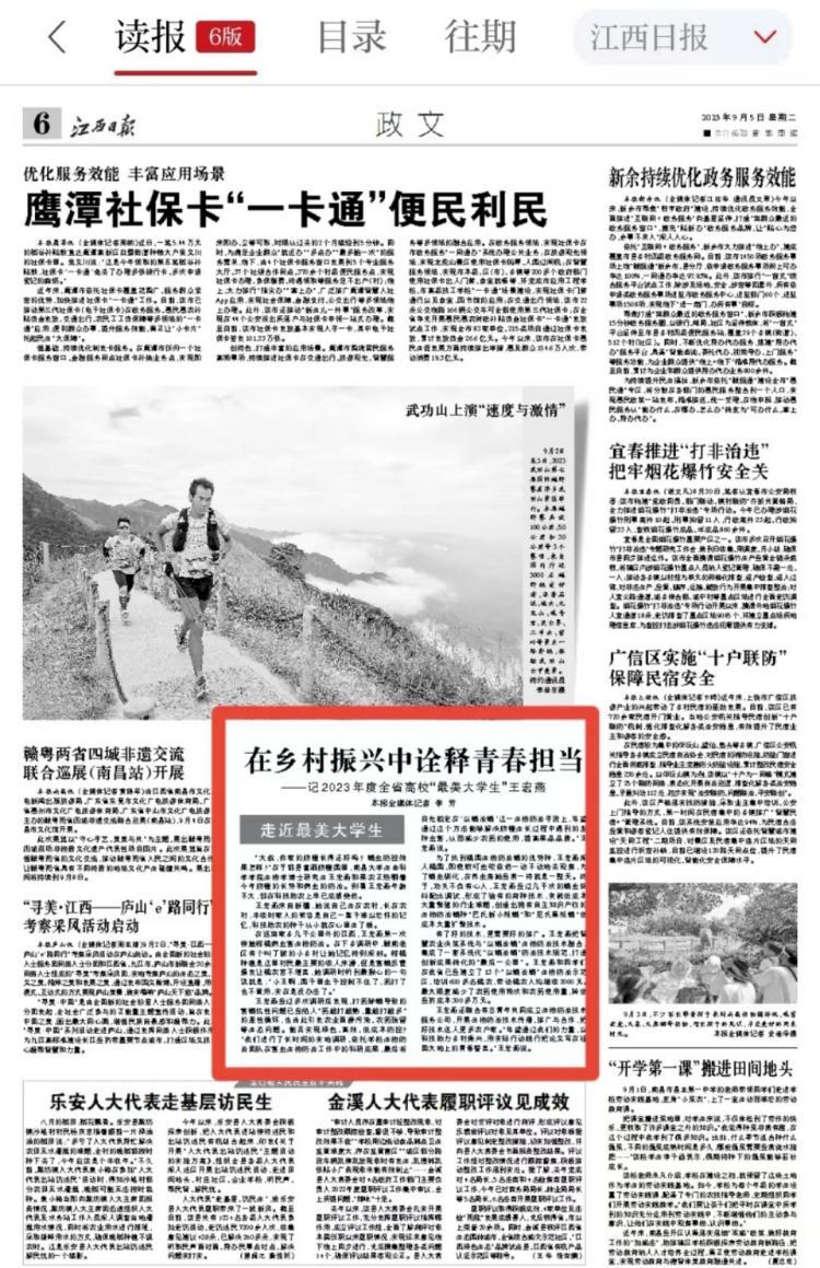 编者按:9月5日,江西日报以《在乡村振兴中诠释青春担当——记2023年度全省高校“最美大学生”王宏燕》为题,报道我校生命科学学院博士、全省最美大学生王宏燕先进事迹。