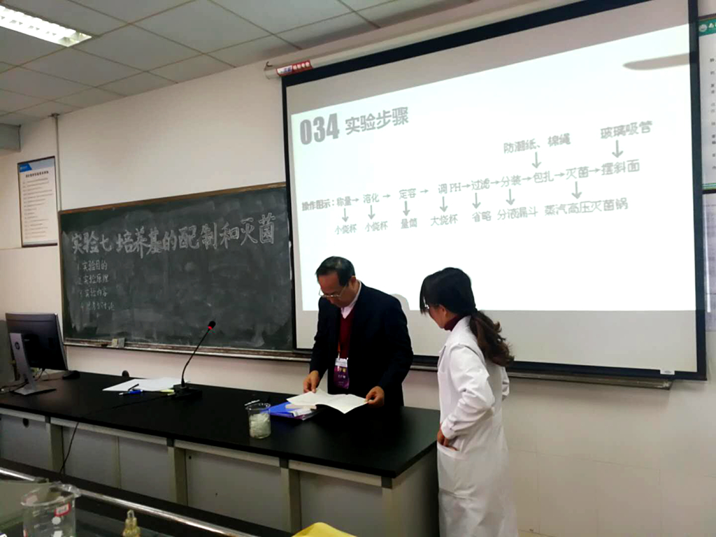 专家组成员王仁卿在理生楼535实验教室看《微生物学实验》课并查看实验档案
