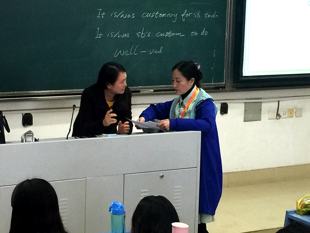 专家组成员景丽英在主教420听黄霞老师《大学英语》课