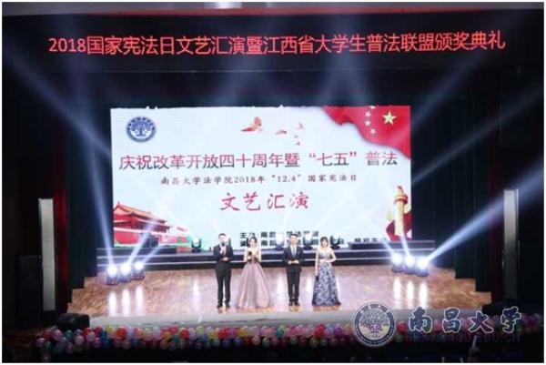 本网讯(学生记者戴琳、徐子琪)12月3日晚,2018国家宪法日文艺汇演暨江西省大学生普法联盟颁奖典礼在音乐厅举行。省司法厅副巡视员刘晨华,省司法厅普法教育处处长胡大德,省普法联盟单位有关负责人,校党委常委、统战部部长滕勇前到场观看演出并为获奖单位颁奖。