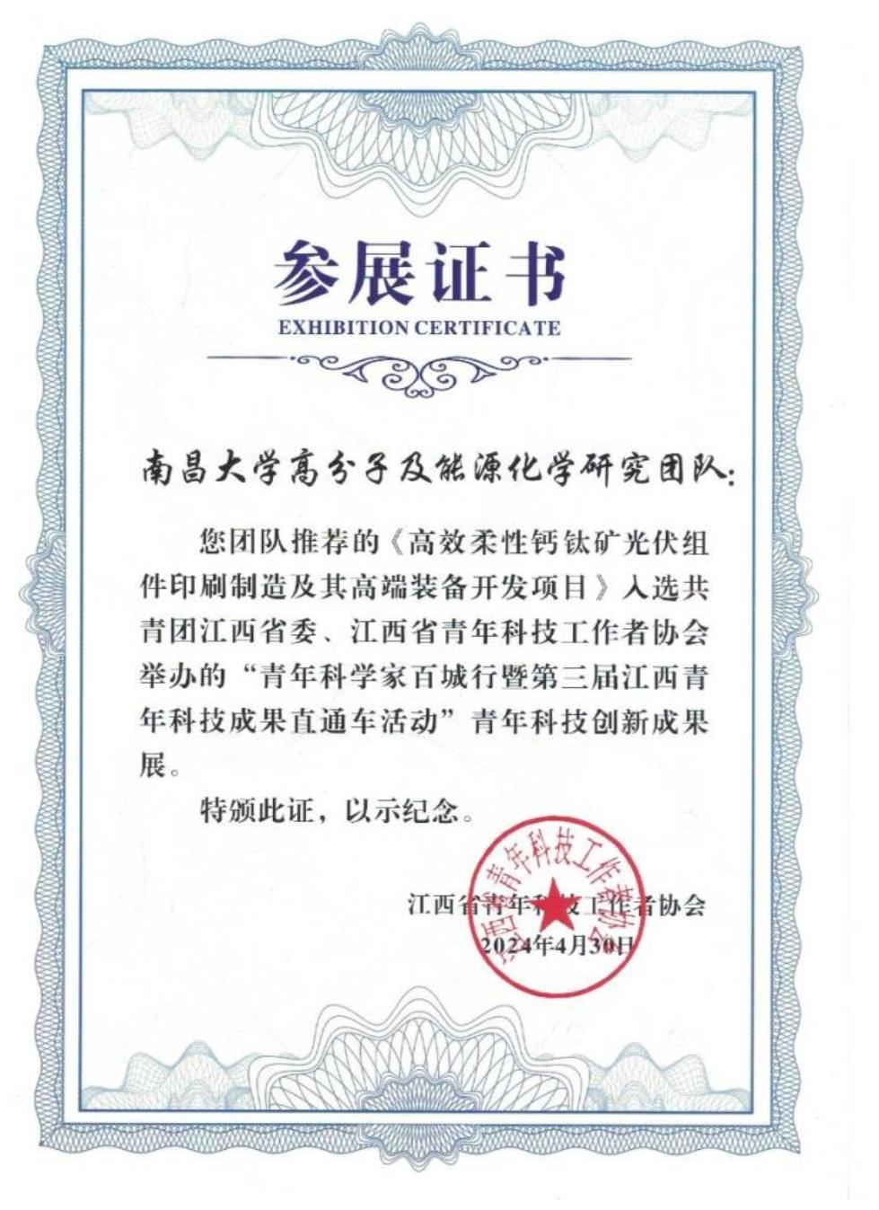 陈义旺教授团队长期以来致力于柔性薄膜太阳电池的研究,主持和完成国家自然科学基金重点项目/杰出青年基金项目/中德国际合作项目/面上项目、科技部973前期研究专项等项目。在Nat. Commun., J. Am. Chem. Soc., Angew. Chem. Int. Edit., Adv. Mater.等国际期刊发表论文 400 余篇, 他引17000余次,成果得到Nature Research、Materials Views、学习强国等国内外媒体专题报道;获授权发明专利49项;获江西省自然科学一等奖、教育部自然科学二等奖、中国发明协会发明创业奖创新奖一等奖等奖励。团队通过电路理论设计和大面积刮涂技术结合,成功制备的钙钛矿光伏组件已经过第三方机构(中国计量科学院、华南国家计量测试中心、中国泰尔实验室)效率认证,其中柔性太阳电池及100 cm2柔性组件认证效率分别达到25.12%和18.51%。