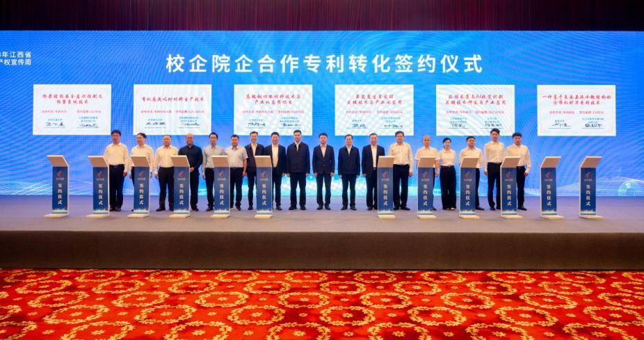 本网讯(化学化工学院)近日,2024年江西省知识产权宣传周活动启动仪式在南昌举行,南昌大学高分子及能源化学研究团队代表参加活动签约仪式。其中,我校化学化工学院陈义旺教授团队围绕柔性钙钛矿太阳电池的专利成果实现转化,在会上正式签署专利转让协议,将《一种基于表面亲疏水微结构的涂布机刮刀》《一种耐弯折柔性光电器件的制备方法》等八项专利转让给九江市柔烁光电科技有限公司。