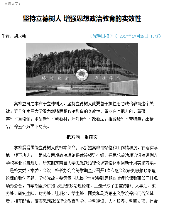 10月19日,光明日报刊发我校党委书记胡永新同志署名文章《坚持立德树人 增强思想政治教育的实效性》,现将全文摘录如下,供大家参考学习: