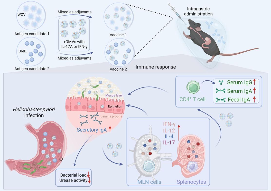 幽门螺杆菌感染是慢性胃炎、消化性溃疡及胃癌的主要病因。由于抗生素耐药性问题日益严重,疫苗接种成为有前景的防控策略。然而,传统佐剂主要诱导Th2型免疫应答,难以有效清除定植于胃黏膜的病原体;而强效佐剂如霍乱毒素存在安全隐患。因此,精准调控黏膜免疫应答成为该领域长期未解的瓶颈。