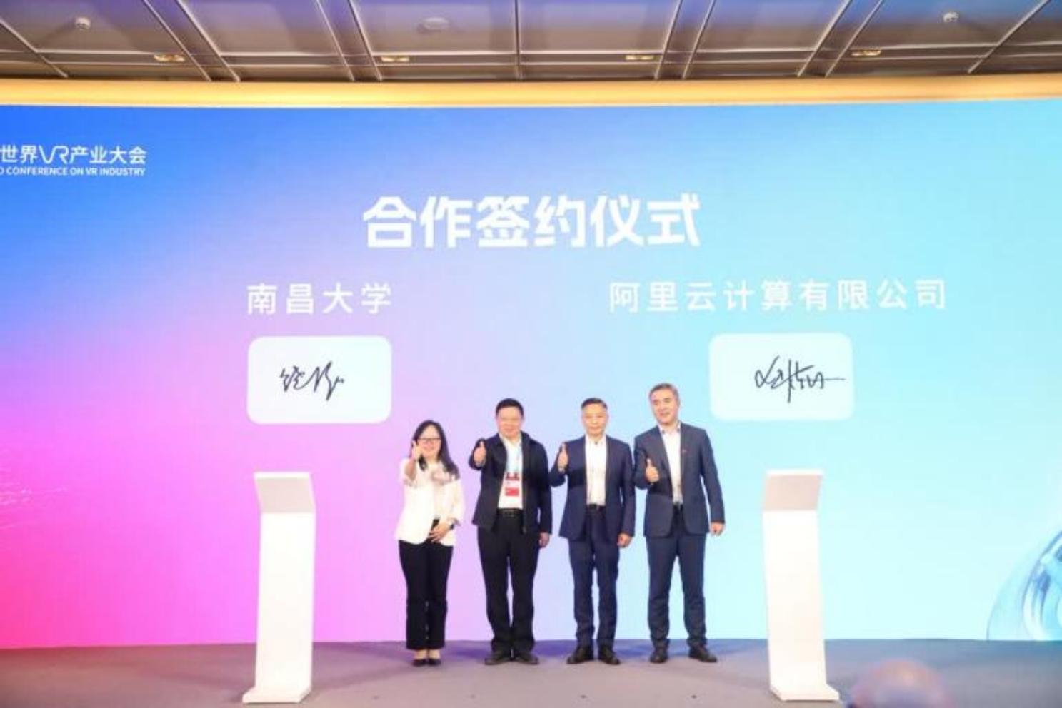 本网讯(软件学院、信息工程学院)10月19日至20日,2023世界VR产业大会在南昌召开,我校积极参与大会,联合承办大会 “Al大模型与智能计算创新发展”主题论坛,与阿里云计算有限公司签署了校企合作框架协议,并联合牵头发起成立全国虚拟现实行业产教融合共同体。校党委书记罗嗣海、副校长吴丹出席大会。